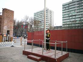 天微微亮,国旗护卫队成员迈着铿锵的步伐来到了国旗台下,全场一片肃静。在激昂的《义勇军进行曲》中,护旗手振臂一挥,鲜艳的五星红旗随风展开,升旗手随之将五星红旗徐徐升起,五星红旗在晨曦中迎风飘扬在旗杆顶端。全体同学也缓缓行注目礼,唱国歌,表达自己对神圣的国旗和祖国的热爱。