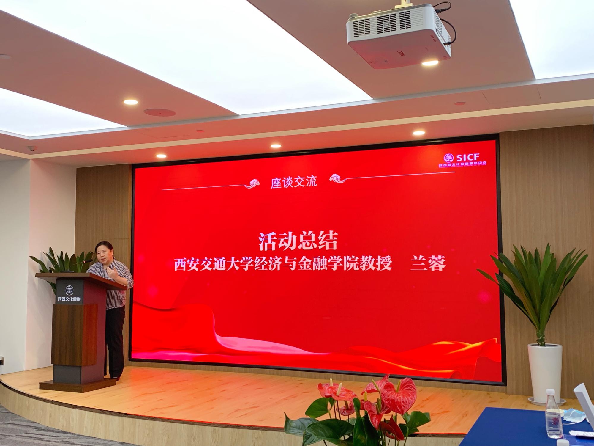 最后,兰蓉老师代表实践团队对此次调研进行了总结。兰老师首先对陕西省文化金融服务中心各位领导的热情接待表示感谢,指出陕西文化金融服务中心的成立,推动了全省文化金融服务体系的创新。这种以金融激活文化、以文化支撑金融的发展,是打造文化金融示范区的又一生动的实践创举。目前受新冠肺炎疫情影响,外部环境变化和不稳定性增多,国内经济社会发展任务艰巨繁重,这也对“一带一路”文化金融建设提出了新要求和新挑战。