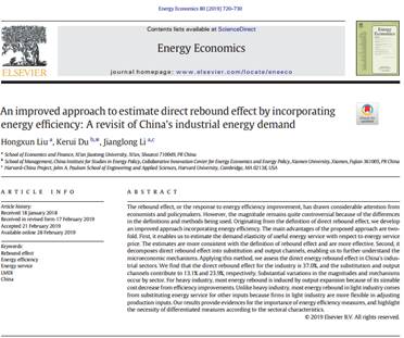 文章信息:Liu, Hongxun; Du, Kerui; Li, Jianglong. An improved approach to estimate direct rebound effect by incorporating energy efficiency: A revisit of China's industrial energy demand.Energy Economics, 2019, 80: 720-730.